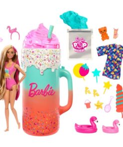 Kids pakken 15 verrassingen uit, waaronder een geurige Barbie pop met van kleur veranderende make-up, een zacht geurend dierenvriendje, vormbaar zand, mode en accessoires die de fantasie prikkelen. Pak de beker uit, til het deksel op en druk op de knop op het handvat om de Barbie pop omhoog te zien rijzen — herhaal het wow-moment keer op keer. Doe de ijsblokjes open en ontdek de verrassingen binnenin; ze zijn herbruikbaar voor nog meer plezier! Verrassingszakjes bevatten extra accessoires. Er is een doek met fruitprint, een paar schoenen, een zwemband, een zak met vormbaar zand en meer. Style Barbie voor een dag plezier in de zon en geef haar een nieuwe look door de kleuren van haar gezicht te veranderen. Kinderen vinden het geweldig om alle speelmogelijkheden te ontdekken in deze verrassende cadeauset! Pop kan niet los staan. Afwijkende kleuren en versieringen mogelijk.