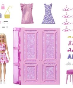 Open de roze kledingkast met glitters en ontdek een speelset van 90 cm breed met 2 kledingrekken, meer dan 20 opbergruimtes, een inklapbare kaptafel met uitklapbare spiegel, een passpiegel en een schoenenrek. Er is zelfs een kussen voor de puppy! Kinderen zullen het geweldig vinden om de meegeleverde Barbie modepop aan te kleden met meer dan 25 kledingstukken en accessoires, waaronder jurken, schoenen, kettingen en portemonnees. Mix en match 3 volledige looks voor Barbie en geniet van fantasierijk spelen! Kinderen kunnen de Barbie pop helpen een outfit te kiezen, te stylen en accessoires te pakken. Vervolgens kan ze zich verder klaarmaken bij de kaptafel voordat ze in stijl met haar pup op pad gaat voor de beste dag ooit! Om het opbergen gemakkelijk te maken, passen alle onderdelen in de kast met roze Barbie handvat voor plezier onderweg. Pop kan niet los staan. Afwijkende kleuren en versieringen mogelijk. Geschikt voor kinderen vanaf 3 jaar.