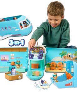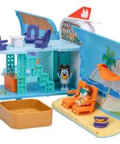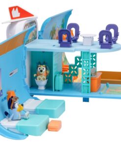 Deze ongelooflijke speelset verandert gemakkelijk van een vliegtuig in een vakantieresort met een boot. Piloot Bluey heeft haar pilotenhoed al op en neemt plaats in de cockpit. Bingo zit heerlijk acherin en is klaar voor de vlucht, daar gaan ze! Beleef allerlei vakantieavonturen met de 15 accessoires, zoals een kofferset, computer, zonnebrillen en nog veel meer! Open de romp van het vliegtuig en ontdek een enorme speelset van 70 cm breed met twee verdiepingen en veel ruimtes om te verkennen, zoals een hotellobby, hotelkamer, een strand, een zwembad en een heerlijke hangmat. De cockpit van het vliegtuig verandert in een boot voor nog meer avonturen! De hele speelset komt tot leven met meer dan 25 geluiden en zinnetjes uit de show. Versier de speelset met de stickers op het stickervel. Geschikt voor kinderen vanaf 3 jaar.