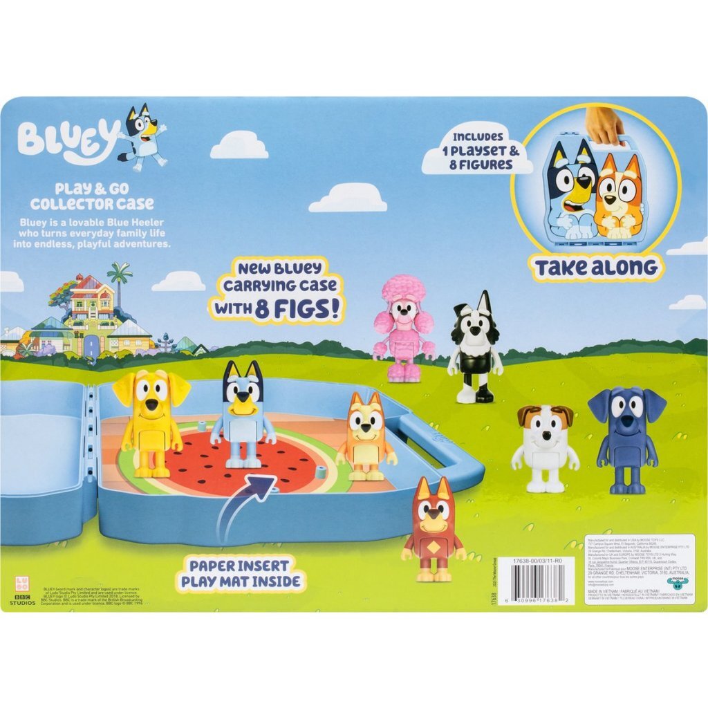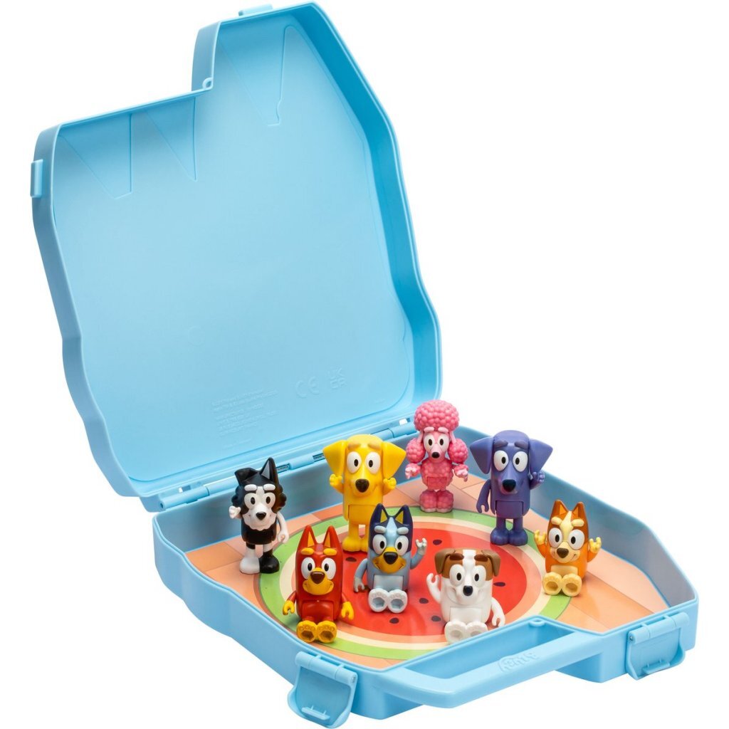 Op de handige koffer met greep staan Bluey en Bingo afgebeeld. In de koffer vind je 8 speelfiguren uit de Bluey animatieserie, waarmee je allerlei avonturen kunt naspelen. Ook zijn ze te gebruiken bij alle Bluey speelsets (los verkrijgbaar). Klap de koffer open en speel met de figuren in de koffer op de leuke papieren speelmat.