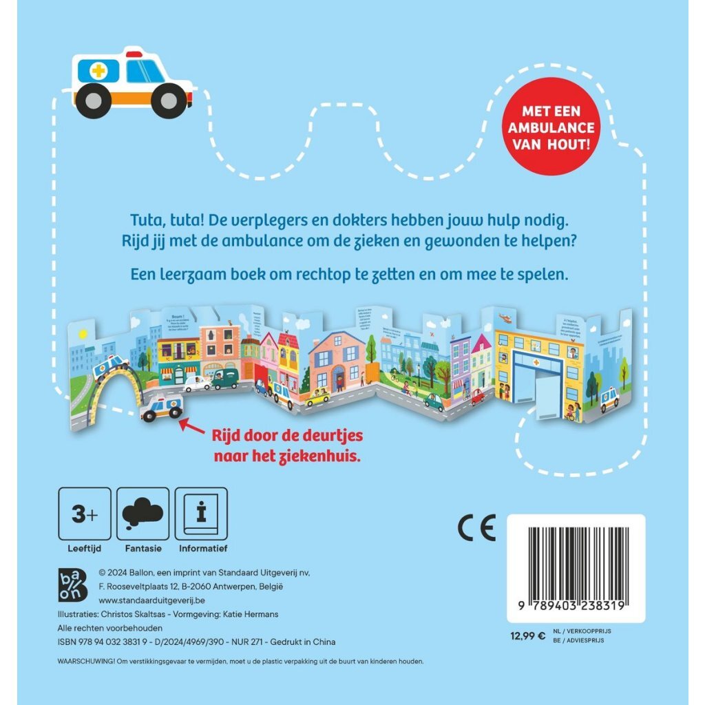 Tuta, tuta! De verplegers en dokters hebben jouw hulp nodig. Rijd jij met de houten ambulance auto om de zieken en gewonden te helpen? Een leerzaam boek om rechtop te zetten en om mee te spelen.