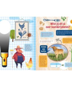 Kip legt een ei. Het is haar allereerste ei. Kip is er heel trots op. Maar als ze haar ei aan Haan wil laten zien, is het ineens verdwenen. Hoe kan dat? Haan, Paard en Koe gaan voor Kip op zoek. Ga je mee? Pak je zaklamp en ga op zoek naar de plaatjes uit de verhalen. Vrolijke voorleesverhalen met prachtige zoekplaten. Met een “zaklamp” van stevig karton. Leuke weetjes over boerderijdieren.