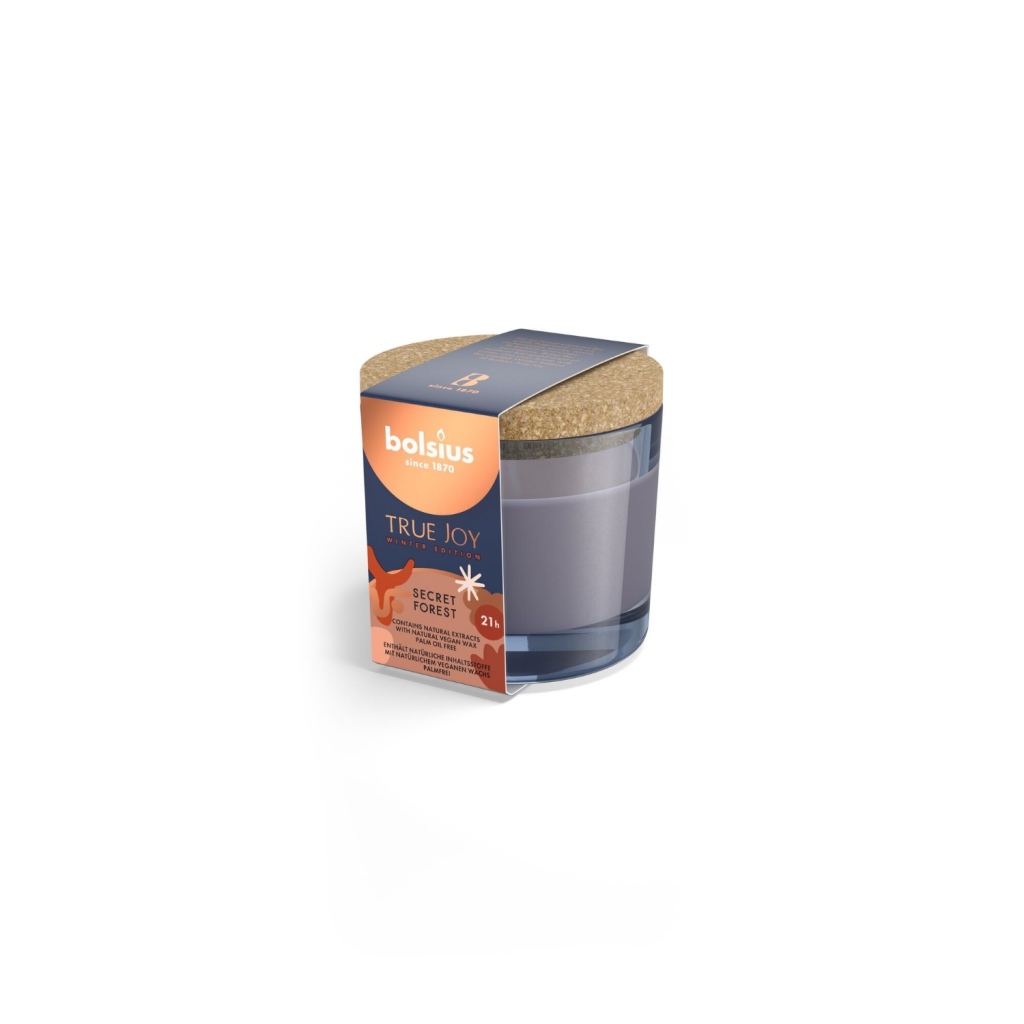 Bolsius True Joy geurglas met kurkSecret Forest66x83 mm. Geurkaars in glad met een deksel van kurk voor luchtdichte afsluiting. DeSecret Forestgeurkaars heeft de geur van eenoosterse tuinin bloei, en biedt ca. 21 branduren.