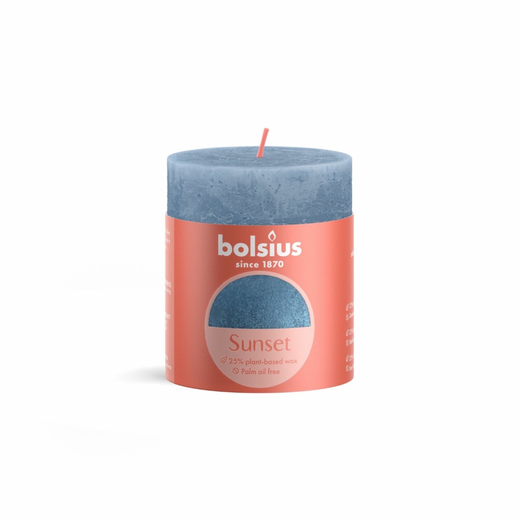 Deze klassieke rustieke Bolsius kaars in de kleurSunset met een blauwe metallic gloedheeft een afmeting van8x 6,8cm. De kaars brand na ca.35 uren op en roet niet.
