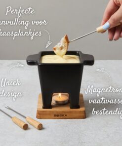 Deze set biedt genoeg ruimte voor 175 gram saus of kaasfondue. Perfect als snack bij een romantisch avondje met zn tweeën of als borrelhapje bij een feest.Deze complete fondueset bevat een kleine fonduepan, twee fonduevorken en een donkerhouten onderstel. Wil je de kaas snel laten smelten? Dat is zo geregeld! Het fonduepannetje – 300 ml tot de rand – mag namelijk in de magnetron. Zet hem op het handige onderstel en het waxinelichtje houdt de gesmolten kaas voor je warm. Na gebruik kan het pannetje gewoon de vaatwasser in. Het onderstel maak je gemakkelijk met een doekje schoon. Kleur: zwart.