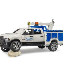 Bruder 02509 RAM 2500 servicewagenmet kraan en accessoires. De kraan kan echt gebruikt worden om kleine voorwerpen op te pakken. De deuren van de wagen kunnen geopend worden en de wielen kunnen echt draaien. Inclusief werkend zwaailicht (batterij inbegrepen). Geschikt voor kinderen vanaf 4 jaar.