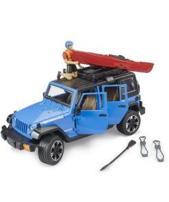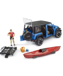 Tegenwoordig zijn kajaks een symbool van sport- en vrijetijdsplezier op het water. Dit sportapparaat combineert de voordelen van holistische fitnesstraining met een bijzondere verbondenheid met de natuur. Met deze watergenoten kom je op plekken aan de oevers waar andere watersporters niet kunnen komen. Om de mooiste watersportgebieden te bereiken is de Jeep Wrangler Rubicon Unlimited een echt offroad talent. Naast het tweedelige afneembare segmentdak kunnen ook de motorkap, de achterklep en alle vier de deuren geopend worden. Uiteraard is de ruimte zodanig dat er vier Bruder bworld-figuren in het voertuig passen. Als alternatief voor de volledige stoel kan de achterbank worden verwijderd, zodat accessoires vervolgens met behulp van de Bruder standaardconnectoren in de laadruimte kunnen worden opgeborgen. De extra stuurkolom dient voor eenvoudig sturen via het dakluik en kan bij niet-gebruik in de voertuigvloer worden opgeborgen. De assen zijn geveerd zoals typisch is voor terreinwagens en de geprofileerde wielen zijn voorzien van verchroomde velgen met een aantrekkelijke SUV-look. De kajak wordt vervoerd op het meegeleverde imperiaal.