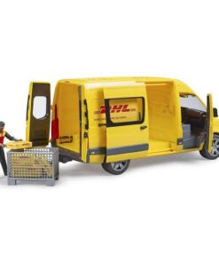 Deze Mercedes Benz Sprinter is erg gedetailleerd uitgevoerd en heeft achterdeuren en een zijdeur die open kunnen. De gele bus heeft de bekende DHL bestickering en een pakketbezorger als bestuurder. Achterin de wagen liggen pakketten. Geschikt voor kinderen vanaf 4 jaar.