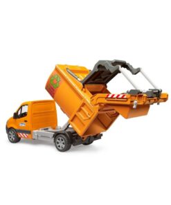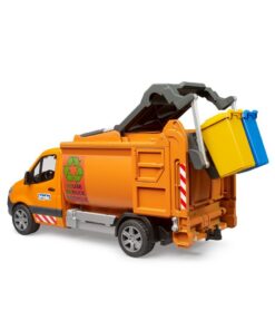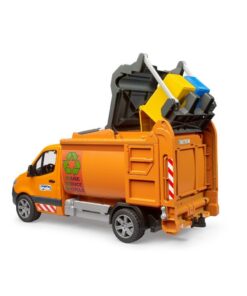 Voor de afvalverwerking in smalle binnenstedelijke gebieden en voetgangersgebieden is er een compact op de Sprinter gebaseerd afvalverwerkingsvoertuig. Dit belangrijke voertuig voor alle gemeentelijke dienstverleners verschijnt nu op schaal 1:16 tussen de bedrijfsvoertuigen van Bruder. Net als het origineel kunnen kleine vuilnisbakken en afvalcontainers geleegd worden. Er zijn twee zijflappen voor vuilniszakken en vergeten afval. Om de vuilnisbakken of afvalcontainers te legen, gaat de voertuigklep automatisch open wanneer de vuilnisbakken naar boven worden getild om te worden geleegd. Nadat de vuilnisbakken geleegd en neergelaten zijn, sluit de bouwklep weer. Het voertuig wordt geleegd door de achterklep te ontgrendelen en te openen en de carrosserie te kantelen.