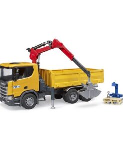 De nieuwe bestuurderscabine toont het typische, dynamische ontwerp van Scania.Er zijn inklapbare buitenspiegels en openslaande deuren leverbaar.De voertuigcarrosserie bestaat uit een kantelbare laadruimte met drie neerklapbare zijwanden.Achter de bestuurderscabine bevindt zich een 360° draaibare, uitklapbare en telescopische laadkraan die met de hand vrij kan worden verplaatst en door de vergrendeling in elke positie kan worden gehouden.Daarnaast zijn er steunen die aan de zijkant van de laadkraan uitgetrokken en neergelaten kunnen worden om het voertuig meer stabiliteit te geven tijdens een laadproces.Omdat er ook een palletvork met twee pallets en een schepgrijper wordt meegeleverd, kan het spel direct beginnen.