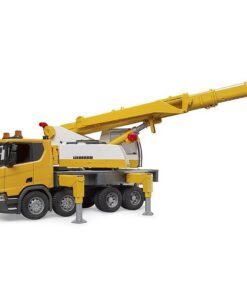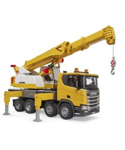 De truck is al behoorlijk groot als de telescooplengte wordt verlengd en kan met een extra giek nog verder worden uitgebreid.Wanneer de kraanarm volledig is uitgeschoven en opgebouwd, is de kraan 1,30 m hoog en torent hij boven enkele kleinere bouwers uit.Stabiliteit in deze dimensie is uiteraard een must.Dankzij de draaibare en individueel verstelbare steunpoten van het voertuigplatform wordt een hoge stabiliteit tegen kantelen bereikt.Voor nog meer stabiliteit kan het aangebouwde contragewicht gebruikt worden zoals bij de originele kraan.Om ervoor te zorgen dat het model voldoende gewicht heeft, kan het gevuld worden met zand.De kabellier met vergrendeling en overbelastingsbeveiliging maakt een eenvoudige bediening van de kraanhaak mogelijk bij het heffen en dalen, zelfs van grote onderdelen.Net als het origineel heeft de cabine van de kraanmachinist een raambeschermingsframe en een schuifdeur die open kan.Een in het platform geïntegreerd gereedschapscompartiment rondt de vele functies van de kraan af.De nieuw ontwikkelde Scania Super R-cabine heeft openslaande deuren en inklapbare buitenspiegels.Voor nog meer speelwaarde is ook de Light & Sound-module inbegrepen.