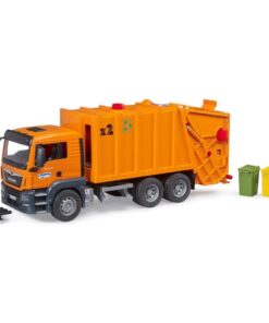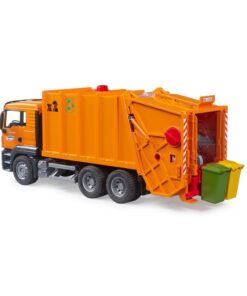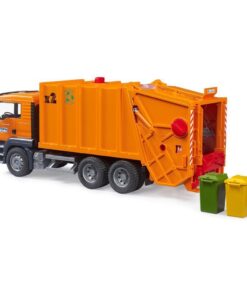 De bestuurderscabine heeft deuren die open kunnen en biedt elke bworld figuur een moderne werkplek. Het gehele laad- en losproces van de vuilniswagen wordt aangestuurd door een uniek draaiwielmechanisme, waardoor twee vuilnisbakken tegelijkertijd geleegd kunnen worden.Dezelfde procedure is ook mogelijk met de afvalcontainer dankzij de flexibele steunbeugel.Het proces: de afvalbakken worden in de draagconsole geduwd, het afval wordt vervolgens geleegd in de bak door deze op te tillen.Terwijl het wiel draait, wordt dit vervolgens in het functionele persmechanisme getrokken, verdicht en vervolgens naar de afvalbunker getransporteerd.Dit proces wordt gevisualiseerd door middel van een kijkvenster.De hendel die aan de bovenkant van de afvalbunker is bevestigd, wordt gebruikt om het afval te dumpen.Door aan deze hendel te draaien wordt het afval middels de loswagen naar buiten getransporteerd, langs de omhoog geschoven laad- en losunit.Twee meegeleverde kleine vuilnisbakken en profielbanden maken het plaatje compleet.
