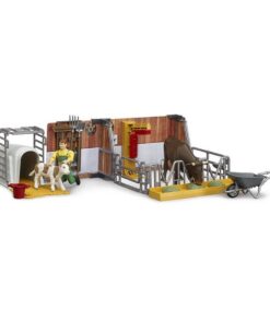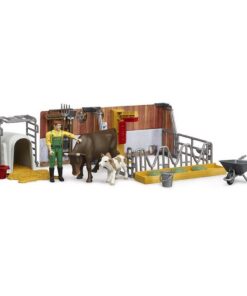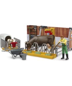 Er is een positieve groei in de agrarische sector.Naast de bekende koeien en stieren bevat het Bruder assortiment nu ook het juiste kalf.De gloednieuwe bworld koe- en kalverstal themaset bevat een moderne stal voor de koe met een voederbak en massageborstels.Voor een veilige huisvesting van het kalf wordt een kalverbox met drinkemmer meegeleverd.Beide dieren worden goed verzorgd door de meegeleverde boer, die kruiwagens en toebehoren gebruikt om de dieren te voeren en de stal schoon te maken. Geschikt voor kinderen vanaf 4 jaar.