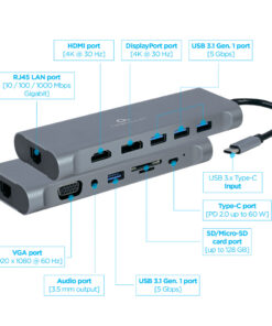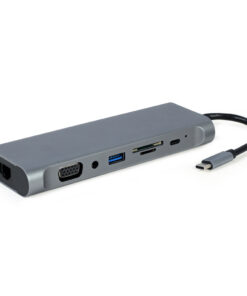 - USB Type-C 8-in-1 multi-poort adapter (Hub3.0 + HDMI + DisplayPort + VGA + PD + kaartlezer + LAN + stereo audio)
