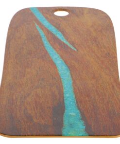 Kersenhout-look serveerplank van 53 x 20 cm, met turquoise versiering. Met uitsparing voor ophangen of handig beetpakken.