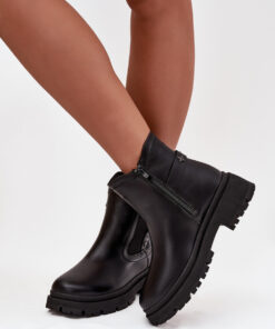 Dameslaarzen in de stijl van enkellaarzen, gemaakt van kunstleer, zijn een tijdloos voorstel voor koudere dagen. Het model op een stevige blokhak zorgt voor comfort en zekerheid bij elke stap. De schoenen zijn voorzien van een rits, wat het aan- en uittrekken vergemakkelijkt, terwijl het gevoerde interieur comfort en warmte garandeert tijdens het dragen. Kleine, decoratieve details op de riem voegen een subtiel, elegant karakter toe aan het geheel. Dit zijn klassieke en tegelijkertijd stijlvolle enkellaarzen die perfect passen bij vele outfits.