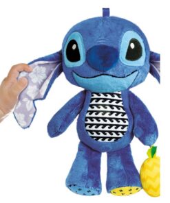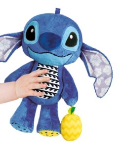 Schattige pluche knuffel van Stitch. Deze knuffel maakt een piep-geluidje als je in zijn buik knijpt, heeft knisperende oortjes en een rammelend belletje in de vrucht die hij vasthoud. Geschikt voor kinderen vanaf 6 maanden.