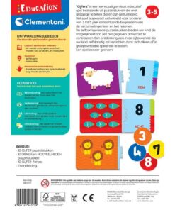 Clementoni Education cijfersis een eenvoudig en leuk educatief spel bestaande uit puzzelstukjes die met grappige te tellen dieren zijn geïllustreerd. Het spel is speciaal ontwikkeld voor kinderen van 3 tot 5 jaar en leert ze de beginselen van de verzamelingenleer en het rekenen. De zelfcorrigerende puzzelstukken bieden uw kind de mogelijkheid om zelf het gegeven antwoord te controleren. Een ontdekkingsreis in de cijferwereld die uw kind zelfstandig zal verrichten door zich alleen of in groepsverband spelende te testen. Een spel zonder grenzen!