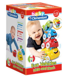 - Vier leuke voertuigen van Clementoni: een bus, een vrachtwagen, een auto en een motor waarmee je kan spelen, opstapelen en meer kunt ontdekken