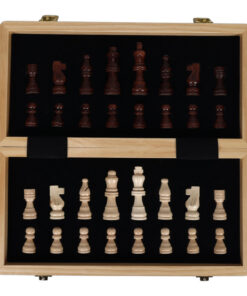 Het bord is opklapbaar en de speelstukken kun je handig in het bord opbergen. Afmeting van het speelbord is 29,5 x 29,5 cm. Inclusief 32 schaakstukken. Geschikt voor kinderen vanaf 6 jaar.