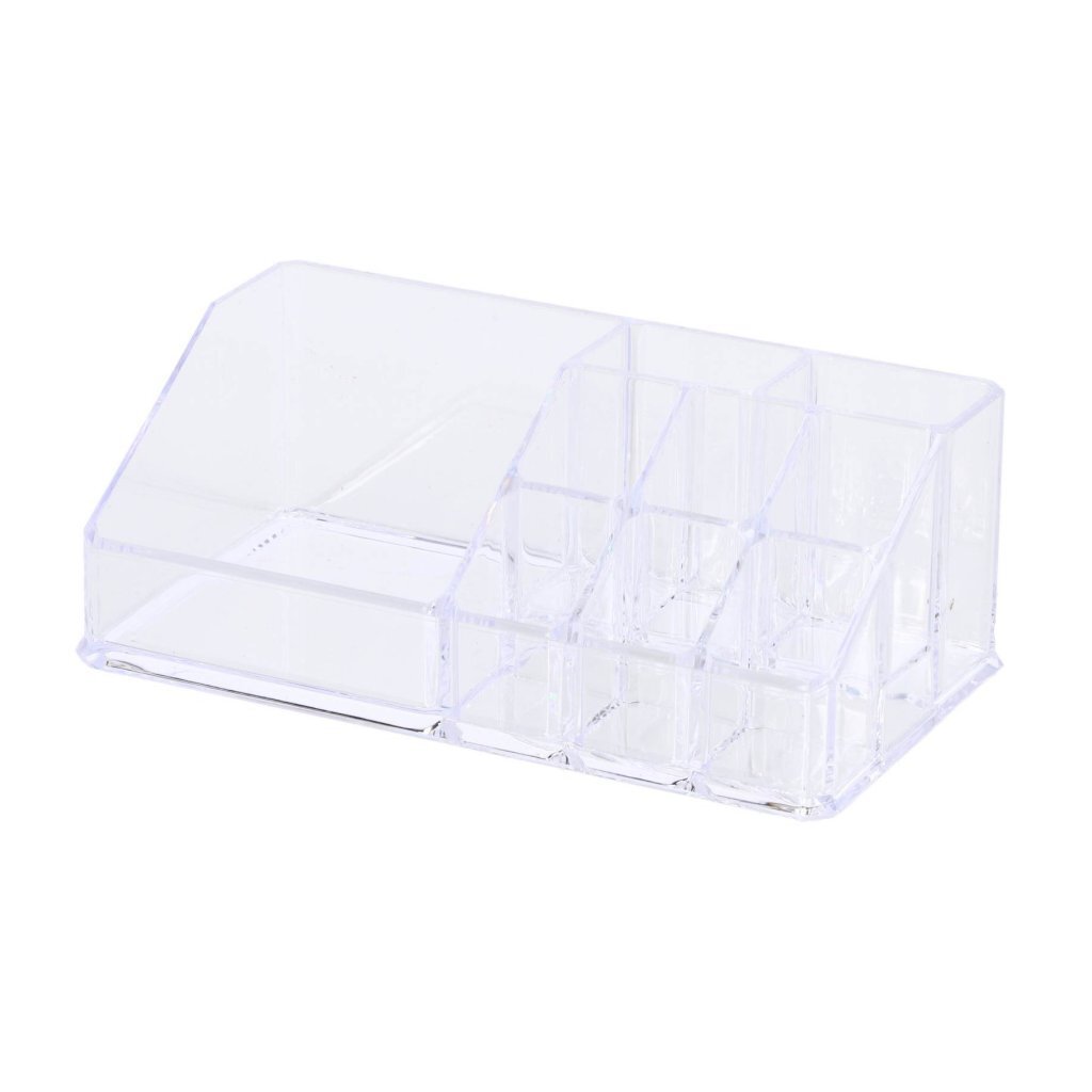 Een transparant cosmetica opbergbakje met diverse vakken voor het opbergen van diverse make-up producten. Afmetingen: 17,5 x 9,5 x 6,5 cm.