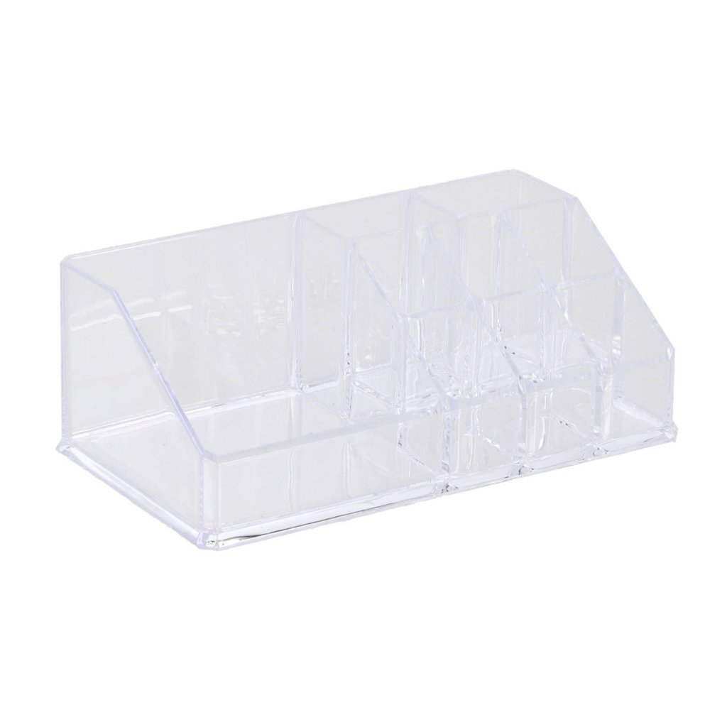 Een transparant cosmetica opbergbakje met diverse vakken voor het opbergen van diverse make-up producten. Afmetingen: 17,5 x 9,5 x 6,5 cm.