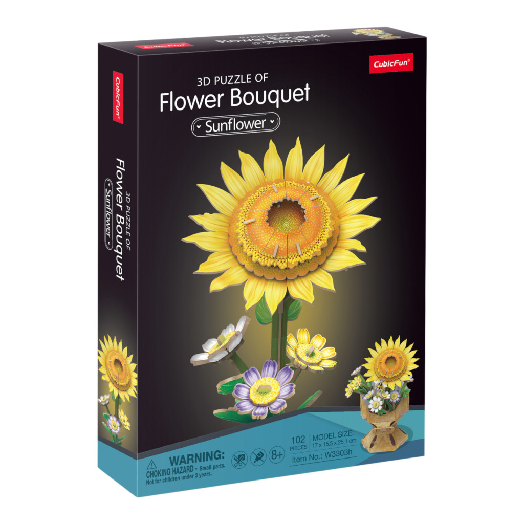 Prachtige 3Dpuzzel van de serie Flower Bouquet van Cubic Fun. Bestaat uit 102 stukjes. Je hebt geen lijm of schaar nodig om deze zonnebloem te creëren. In elkaar zijn de afmetingen: 17 x 15,5 x 25 cm. Geschikt voor kinderen vanaf 8 jaar.