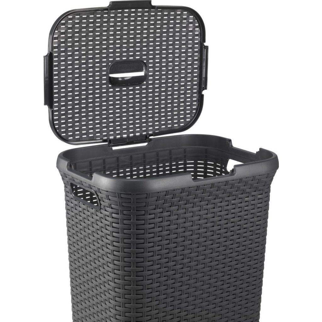 Door het vlechtwerk kan de box optimale luchten. Het scharnierpunt van het deksel kan zowel aan de korte als aan de lange kant gemonteerd kan worden, maar het deksel kan er eventueel ook los opgelegd worden. Dankzij zijn speciale greep is het extra gemakkelijk om hem te openen. Daarnaast is de wasmand gemaakt van minstens70% gerecycled materiaal.