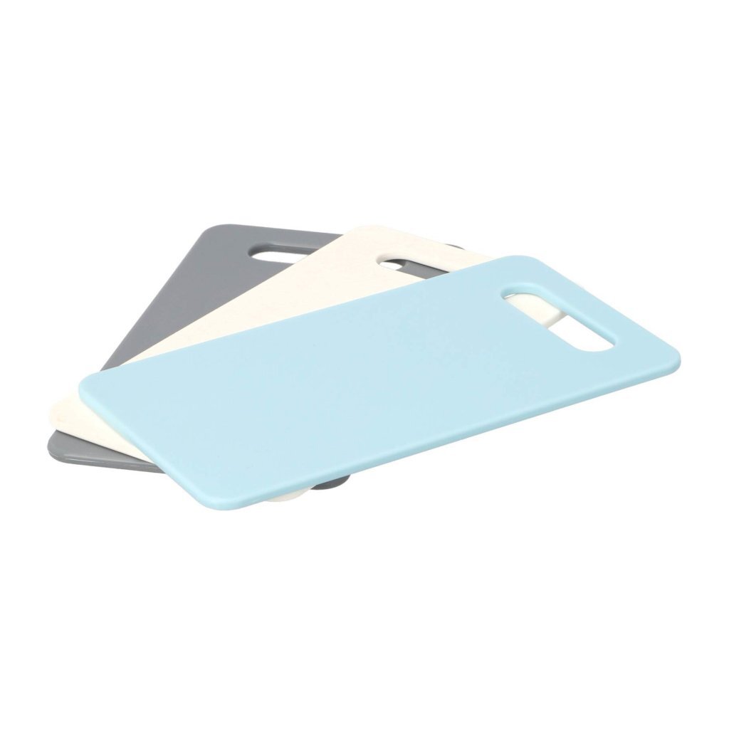 Set van 3 kunststof snijplanken van Daily Home. Formaat per plank: 24,8 x 13,9 cm. Voorzien van handgreep. Ideaal voor gescheiden gebruik (vlees, groenten, brood). Compact en praktisch voor dagelijks gebruik.