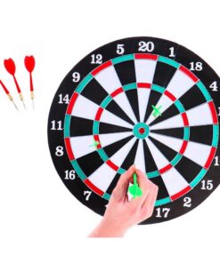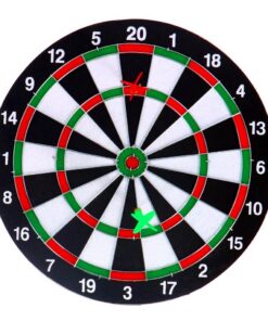 Tweezijdig dartbord met een diameter van 37 cm. De ene kant is een klassiek dartbord, de andere kant is een dartbord verdeeld in circles, met de hoogste puntenwaarde op de bullseye en de laagste op de buitenring. Inclusief 3 groene en 3 rode pijltjes. Geschikt voor kinderen vanaf 8 jaar.