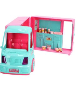 21-delige speelset in de vorm van een dessert truck. Inclusief speelpop. De truck is ongeveer 50 cm groot en 20 cm breed. Inclusief veel accessoires, zoals verkoopwaar, en een tafel met twee stoelen. Geschikt voor kinderen vanaf 3 jaar.