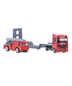 Transporter van die-cast, metvoertuig achterop de oplegger. Schaal 1:87. Geschikt voor kinderen vanaf 3 jaar.Verkrijgbaar in 2 verschillende versies. U kunt niet kiezen, maar ontvangt een willekeurige uitvoering.