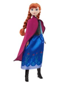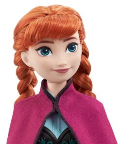 Deze Disney Frozen Anna pop is genspireerd op de onverschrokken en vastberaden heldin uit Disney’s Frozen! Deze beweegbare modepop wordt weergegeven in haar kenmerkende reisoutfit, met accessoires zoals schoenen en een zachte cape plus rokje. Met haar outfit uit de film kan deze Anna Pop elk avontuur aan om het koninkrijk te redden! Pop kan niet los staan. Kleuren en versieringen kunnen variren.