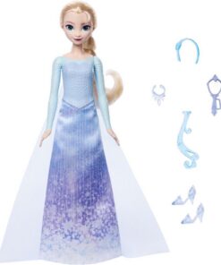 - Als laatste onthullen ze een prachtige Elsa modepop met zacht haar, opgestoken in een zijknot, een rok die aan en uit kan, en modeaccessoires zoals schoenen en een ketting om haar vorstelijke look compleet te maken