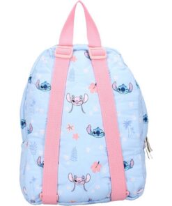 De rugzak is lichtblauw-lichtroze van kleur en heeft op de voorkant een bloemige print met Stitch. Het hoofdvak biedt voldoende ruimte voor bijvoorbeeld schoolspullen. Voor kleinere spulletjes komt het voorvak goed van pas. Beide vakken sluiten met een rits en verder is tas afgewerkt met roze details. Aan de bovenkant van de rugzak is een handige lus waardoor de tas ook aan de hand te dragen is. De schouderbanden zijn verstelbaar en voor iedereen op maat te maken.