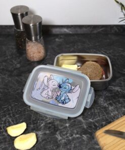 Schattige rvs lunchbox met kunststof deksel. Op het deksel een afbeelding van Stitch met zijn vriendinnetje Angel. Deksel sluit nauw aan doormiddel van 4 klemmen. Geschikt voor kinderen vanaf 4 jaar.
