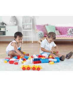 Met de 50 vrolijk gekleurde blokken zijn de mogelijkheden oneindig. Daarnaast heeft de set twee blokjes met wielen, zodat je kindje een eigen locomotief en wagon kan maken. Tevens worden er stickers bijgeleverd om de blokken te versieren en verschillende letters en cijfers te leren. Geschikt voor kindjes vanaf 12 maanden.