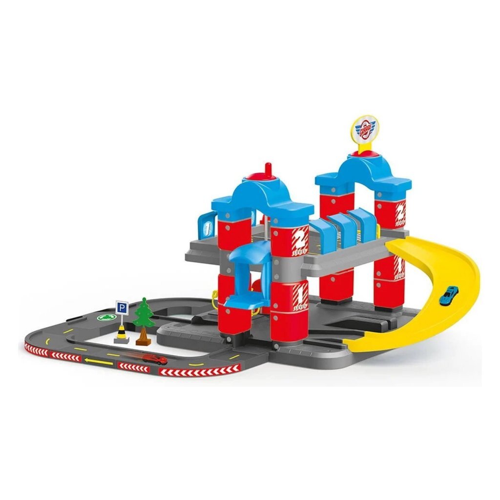 Deze uitgebreide speelset heeft twee etages waar je kindje al zijn favoriete auto’s kan parkeren. De parkeerlagen zijn met elkaar verbonden met een snelle glijbaan, dat wordt leuk! De parkeergarage heeft zelfs een makkelijk bedienbare lift waarmee de autootjes naar de juiste verdieping kunnen worden getild. De verschillende accessoires zoals een benzinestation en diverse verkeersborden maken de speelset helemaal af! De set bevat daarnaast al 2 stoere auto’s waar je kindje mee kan rondrijden. Geschikt voor kinderen vanaf 3 jaar.