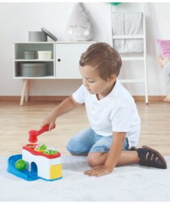 Sla met de hamer de ballen door de gaten en kijk waar ze uitkomen. Met 3 ballen. Geschikt voor kinderen vanaf 1 jaar.