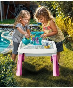 Dolu zand-watertafel met accessoires, kleur: roze/wit. Afmeting: 54,5 x 45 x 45 cm. Geschikt voor kinderen vanaf 2 jaar.