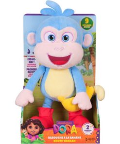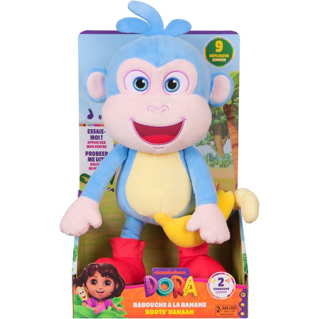 Deze schattige pluche knuffel van 33 cm brengt Doras beste vriend tot leven, met banaan-tastische details die fans geweldig zullen vinden. Hij praat Nederlands en heeft zachte blauwe vacht met crèmekleurige accenten. Hij heeft ook een gele banaan die hij met zijn met klittenband gevoerde handjes kan vasthouden voor extra sensorisch speelplezier. Zijn zachte, knuffelige lichaam en uitnodigende, heldere glimlach stimuleren tactiel spel en dat alles veilig voor peuters vanaf 3 jaar.Deze innovatieve en interactieve knuffel komt tot leven met een zachte druk op zijn buik en zingt en praat dan! Boots zingt 2 liedjes, waaronder het themalied van hem en Dora, en zegt 9 bekende, grappige zinnetjes uit de show!