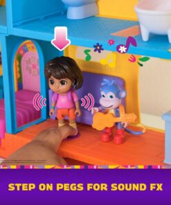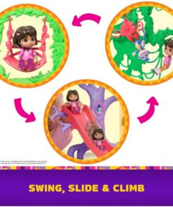 Dit huis van 91,4 cm biedt eindeloos speelplezier, kamers om in te richten en buitenspeelavonturen op de schommel, glijbaan of in de klimboom. Met Dora en Boots, en Doras iconische hulpje Rugzak. Deze speelset stimuleert fantasierijk spel, van dansen op de draaiende vloer tot een onverwacht bezoek van Zwieber. Buiten kunnen de figuurtjes schommelen op de lianen, over de wiebelbrug lopen en nog veel meer. Binnen zijn er verschillende speelruimtes om te verkennen en in te richten met poppenhuismeubels. Druk op de knop in de woonkamer om geluiden en tweetalige zinnen te activeren.