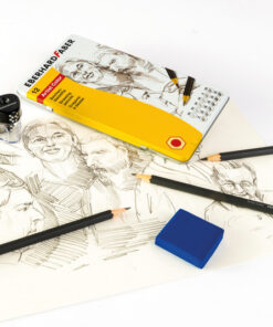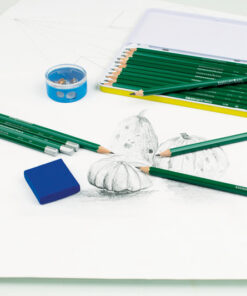 Schrijf- en tekenpotlood in bliketui. 12 Potloden met 12 verschillende hardtegraden. Potlood is groen gelakt en heeft een breukvaste stift.