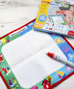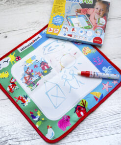 Tekenmat voor kleurplezier met water. Twee kleurplaatmotieven (onder water en boerderij) en een vrij kleurvlak waarop je met een aquastift kunt tekenen en kleuren. Traint de fijne motoriek. Geschikt voor kinderen vanaf 3 jaar. Na het drogen verdwijnt alles en kan het schilderplezier opnieuw beginnenVoor het schoonmaken de mat met een vochtige doek afvegen – niet wassen, geen schoonmaakmiddel en reinigingsmiddelen gebruiken. Laat de mat en de stift na gebruik volledig drogen. Inhoud: 1 tekenmat 32x32cm, 1 aqua stift.