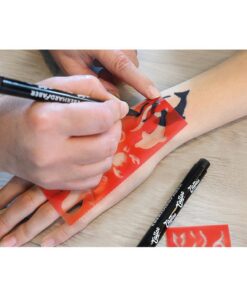 Stiften speciaal voor op de huid, u maakt nu de mooiste versieringen en/of tekeningen op uw huid. Deze set bevat 2 zwarte tattoo stiften. Ook handig zijn de 4 meegeleverde vellen met verschillende sjablonen. Deze inkt blijft minimaal 60 uur zichtbaar op de huid en is dermatologisch getest. Afhankelijk van het huidtype kunnen de kleuren afwijken. Droogtijd is 5 minuten. De inkt kan uit de meeste soorten textiel gewassen worden.