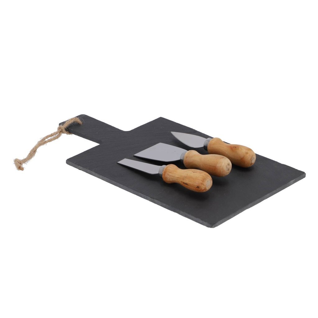 Een set van een kaasplank met 3 kaasmesjes voor het proberen van kaas tijdens bijvoorbeeld de borrel. Afmeting kaasplank: 33 x 17 cm. Lengte mesjes: 14 cm.