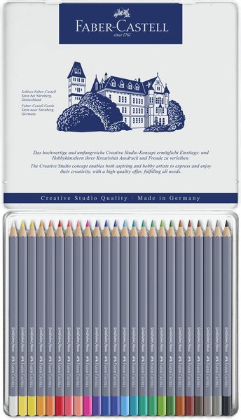 Aquarelpotlood, 3,3 mm breukvaste kern, in hout gevat, hexagonale uitvoering. Volledig met water oplosbaar. Hoogwaardige pigmenten met voortreffelijke kleurkracht en lichtbestendigheid. Verkrijgbaar in 48 kleuren. Houder gelakt in blauwe kleur en achterzijde gelakt in de kleur van het potlood. Bliketui 24 stuks. De Goldfaber aqua kleurpotloden bevatten een samenstelling van was met pigmenten, hulp- en vulstoffen, oppervlakte-actieve stoffen en bevatten geen olie.