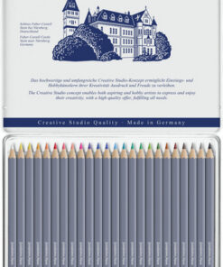 Aquarelpotlood, 3,3 mm breukvaste kern, in hout gevat, hexagonale uitvoering. Volledig met water oplosbaar. Hoogwaardige pigmenten met voortreffelijke kleurkracht en lichtbestendigheid. Verkrijgbaar in 48 kleuren. Houder gelakt in blauwe kleur en achterzijde gelakt in de kleur van het potlood. Bliketui 24 stuks. De Goldfaber aqua kleurpotloden bevatten een samenstelling van was met pigmenten, hulp- en vulstoffen, oppervlakte-actieve stoffen en bevatten geen olie.