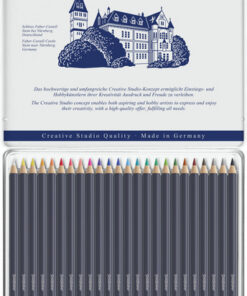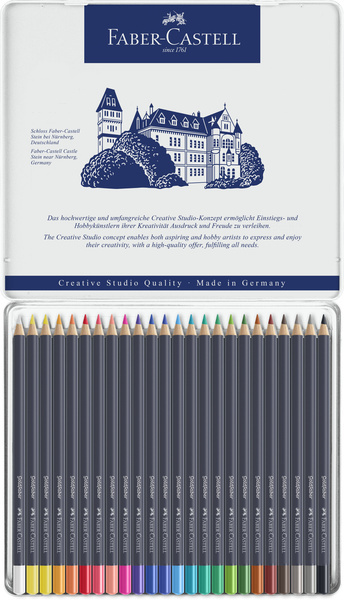 Kleurpotlood, 3,3 mm breukvaste kern, in hout gevat, ronde uitvoering. Hoogwaardige pigmenten met voortreffelijke kleurkracht en lichtbestendigheid. Volledige kleurafgifte en soepel werkend. Wis- en watervast. Verkrijgbaar in 48 kleuren. Houder gelakt in blauwe kleur en achterzijde gelakt in de kleur van het potlood. Bliketui à 24 stuks. De Goldfaber kleurpotloden bevatten een samenstelling van was met pigmenten, hulp- en vulstoffen en bevatten geen olie.