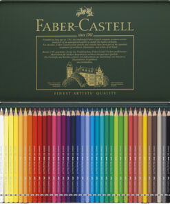 Combinatie van kleurpotlood en aquarelverf. Pigmentrijke aquarelpotloden in hout gevat met een kerndiameter van 3,8 mm. Perfect met water verschilderbaar. Hoogwaardige pigmenten met hoge lichtbestendigheid en kleurkracht. Onbegrensde mengmogelijkheden bij het aquarelleren met 120 kleuren. Zeshoekige uitvoering. Houder gelakt in de kleur van het potlood. Metalen etui à 36 stuks.